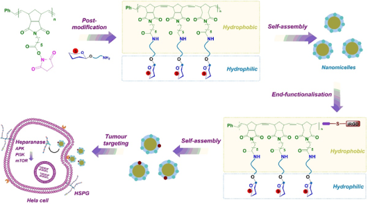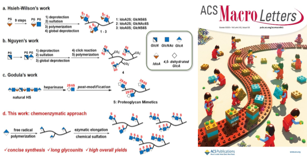 糖胺聚糖(GAGs)是一类线性多糖,由硫酸化的二糖重复单元组成,参与多种生命过程。乙酰肝素酶是一种内源性β-D-葡萄糖醛酸苷酶,在人类肿瘤细胞和特定组织(例如哺乳动物的胎盘)中高水平表达。乙酰肝素酶与多种生长因子的激活有关,这些因子在导致组织修复、细胞粘附、生长、增殖和分化、癌症血管生成和炎症等相关疾病中发挥着重要作用。最近,我们课题组通过正交脱保护化学合成了区域选择性硫酸化的半乳糖胺衍生物,并基于开环易位聚合(ROMP)和后修饰策略生成了系列糖聚合物。具有多种硫酸化模式的半乳糖胺聚合物显示出对乙酰肝素酶的显着抑制作用,其中含有3,4,6-O-硫酸化的GalNAc的糖聚合物能够有效抑制乙酰肝素酶活性以及肿瘤细胞的增殖。在此基础上,具有肿瘤靶向作用的iRGD肽通过末端功能修饰引入。流式细胞术和共聚焦显微镜结果显示,末端功能化的糖聚合物,可以有效进入HeLa细胞并抑制参与肿瘤细胞增殖的信号通路。这些发现有利于推动针对特定肿瘤靶向疗法的新型糖模拟物药物开发。 本课题组通过自由基聚合(FRP)与化学酶法合成联用技术,首次建立了高效制备结构明确的HS聚合物的反应体系,获得了系列侧链长度可控和不同硫酸化修饰的HS聚合物。采用表面等离子体共振(SPR)技术,研究了HS 糖聚合物与晚期糖基化终产物受体(RAGE)的相互作用,发现全硫酸化的HS三糖聚合物与RAGE 蛋白具有最强的结合活性,其KD值为0.3 nM,具有开发成RAGE蛋白拮抗剂的潜力。 | ||||