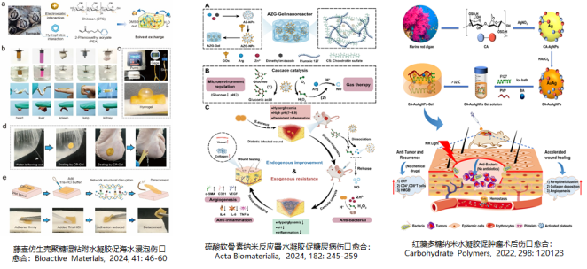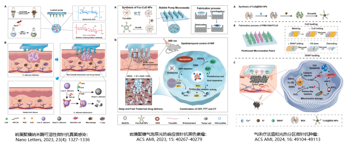 (1)仿生水凝胶:通过模拟藤壶、贻贝等海洋生物的粘附机制,以海藻多糖或寡糖为载体并与无机纳米材料、金属有机框架(MOF) 等材料复合,构建了具有抗菌、止血、湿粘附、促愈合等作用的多功能水凝胶。分别用于促进烧烫伤、全层伤口、糖尿病伤口、肿瘤术后伤口和海水浸泡伤口的愈合。 (2)新型微针:分别构建了纳米酶微针、气泡泵微针、分区微针、热收缩微针等新型微针药物递送系统,并结合光热、光动力、化学动力学和气体治疗等技术,用于皮肤深层真菌感染治疗、肿瘤治疗和促伤口愈合等。 (3)药物靶向递送系统:基于肿瘤微环境或肿瘤干细胞特点,结合基因递送、光热、光动力、免疫治疗和纳米自组装等技术,设计和构建了不同的智能响应性药物靶向递送系统。用于抗肿瘤复发和转移、抗骨关节炎、抗类风湿性关节炎、抗糖尿病关节炎等疾病的治疗。 | ||||||