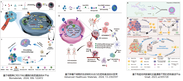 1. Jiaojiao Tao, Yu Dong, ..., Xia Zhao*. Dual Metal Nanoflower Oxygen Pump Microneedles Based on Cuproptosis and STING Pathway Activation for Cancer Immunotherapy. Small, 2025, 21: 2409187 2. Aijia Zhang, Guiyuan Zhao, ..., Xia Zhao*. Barnacle-inspired Chitosan Glycerin Gel for Skin Protection and Wound Healing in Harsh Environments. Chinese Chemical Letters, 2025, 36: 110767 3. Yanguo Su, Rui Chen, ..., Xia Zhao*. Erythrocyte membrane camou?aged celastrol and bilirubin self-assembly for rheumatoid arthritis immunotherapy based on STING inhibition and RONS clearance. Journal of Nanobiotechnology, 2025, 23: 318 4. Yu Wang, Teng Wang, ..., Xia Zhao*. A cancer vaccine factory based on autophagy and efferocytosis to enhance tumor immunotherapy. Chemical Engineering Journal, 2025, 519: 164943 5. Bingjie Wang, Teng Wang, ..., Xia Zhao*, Xiaojia Yang, Xueyang Wang. Circulating immunotherapy strategy based on pyroptosis and STING pathway: Mn-loaded paclitaxel prodrug nanoplatform against tumor progression and metastasis. Biomaterials, 2024, 306: 122472 6. Guangli Xiang, Bingjie Wang, ..., Xia Zhao*. A Zn-MOF-GOx-based Cascade Nanoreactor Promotes Diabetic Infected Wound Healing by NO Releasend Microenvironment Regulation. Acta Biomaterialia, 2024, 182: 245-259 7. Guiyuan Zhao, Aijia Zhang, ..., Xia Zhao*. Barnacle inspired strategy combined with solvent exchange for enhancing wet adhesion of hydrogels to promote seawater-immersed wound healing. Bioactive Materials, 2024, 41: 46-60. 8. Teng Wang, Yu Wang, ..., Xia Zhao*. Fucoidan-Ce6-chloroquine self-assembled hydrogels in situ vaccines to enhance tumor immunotherapy. Carbohydrate Polymers, 2024, 346: 122637 9. Teng Wang, Jiaojiao Tao, ..., Xia Zhao,* Yang Yu, and Xin Meng. Reversing Resistance of Cancer Stem Cells and Enhancing Photodynamic Therapy Based on Hyaluronic Acid Nanomicelles for Preventing Cancer Recurrence and Metastasis. Advanced Healthcare Materials, 2024, 13: 2302597. 10. Bingjie Wang, Wenshang Zhang, ..., Xia Zhao*. Hyaluronic Acid-Based CuS Nanoenzyme Biodegradable Microneedles for Treating Deep Cutaneous Fungal Infection without Drug Resistance[J]. Nano Letters, 2023, 23(4): 1327-1336.