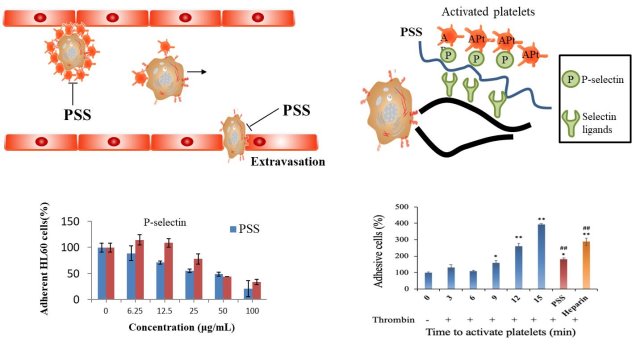 在肿瘤转移灶形成过程中,肿瘤细胞与血小板黏附是帮助肿瘤细胞转移的关键步骤,P-selectin表达在激活的血小板上。它可以与肿瘤细胞上P-selectin配体结合,导肿瘤细胞与血小板之间的黏附,进而导肿瘤转移的发生。P-selectinC型凝集素结构域可结合外源性的唾液酸化,岩藻糖化以及硫酸化多糖。理论上,外源性负电荷多糖可以与P-selectin竞争性结合,进而拮抗P-selectin与肿瘤细胞表面的配体结合,进而抑制肿瘤转移的发生。