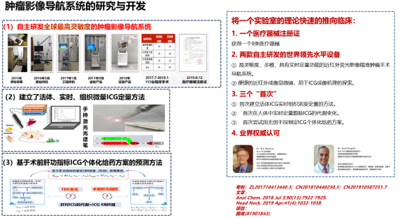 ②基于“微纳”原理的肿瘤精准影像诊断技术及其应用转化 课题组前期参与成功研发、试制了国内首台具有国际领先水平的超高灵敏肿瘤荧光影像导航手术设备(2019年8月12日获得II类医疗器械上市许可,苏械注准20192060927),打破了欧美垄断,并利用其药理学的背景,围绕临床开展了一系列基础科研工作,制定了技术配套的方法学和标准,解决了该技术临床应用的若干关键问题,为该技术推广和发展奠定了基础,也得到了学界和业界的高度关注和认可。2016年起,该设备列为国家科技部十三·五重点攻关项目,其后三次被列入江苏重点研发计划项目,一次江苏工信厅关键核心技术攻关任务。获得了如诺贝尔奖得主W.E.Moerner等生物成像权威的高度评价,并受邀参加了江苏发展大会、临床荧光技术国家年度会议等成像领域国内外高水平会议。 | ||||