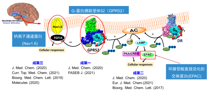 近年来G-蛋白偶联受体52(GPR52)及其下游信号蛋白(环腺苷酸直接活化的交换蛋白1,EPAC1和离子通道蛋白(钠通道1.6NaV1.6)开展了分子靶向抗神经精神疾病药物先导物的设计合成与作用机制研究,形成了以下创新性成果:1)设计合成了可口服、高活性的嘧啶吲哚类特异性GPR52激动剂,验证了GPR52激动剂的体内抗精神分裂药效,系统的临床前评价显示了其良好的成药性和开发前景2)设计合成了成药性高选择性EPAC1激动剂拓展了EPAC1激动剂应用于抗神经精神疾病药物研发的新方向3)以钠离子通道1.6位靶点,设计合成了高活性的小分子拟肽化合物为高效、非成瘾抗神经精神疾病药物开发探索提出了新策略