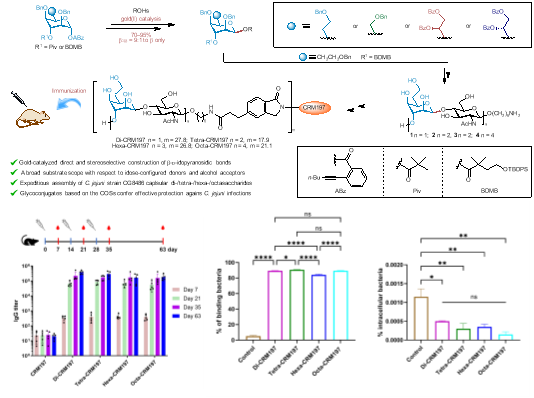 研究团队于2021年发展了制备稀有6-脱氧-庚糖氟苷的新方法,并采用间接构建1,2-顺式-β-D-艾杜糖苷键的策略,首次完成了空肠弯曲杆菌CG8486荚膜六糖的全合成(J. Am. Chem. Soc.2021, 143, 11171-11179.)。继该重要工作后,研究团队利用金(I)催化的邻炔基苯甲酸酯糖苷化反应,首次建立了极具挑战性的β-D-艾杜糖苷键的普适性精准合成策略,适用于多种醇类受体与4种艾杜糖类(α-D-6-脱氧-艾杜庚糖、α-D-艾杜糖及D-/L-甘油型-α-D-艾杜庚糖)邻炔基苯甲酸酯给体的立体选择性β-糖苷化反应,最终实现了关键CG8486菌株荚膜二糖重复单元的多克级制备以及二糖、四糖、六糖及八糖糖苷的高效组装。精准合成了四种糖蛋白复合物(Di-CRM197、Tetra-CRM197、Hexa-CRM197、Octa-CRM197),并对其进行了系统的免疫学评价,结果表明糖蛋白复合物Di-CRM197与其他蛋白复合物具有同等免疫原性,从而推测结构最为简单的二糖可作为开发空肠弯曲杆菌疫苗的最小抗原表位。该研究不仅为含β-D-艾杜糖单元寡糖的高效合成建立了普适性方法,更为开发预防空肠弯曲杆菌感染的糖缀合物疫苗奠定了坚实基础。