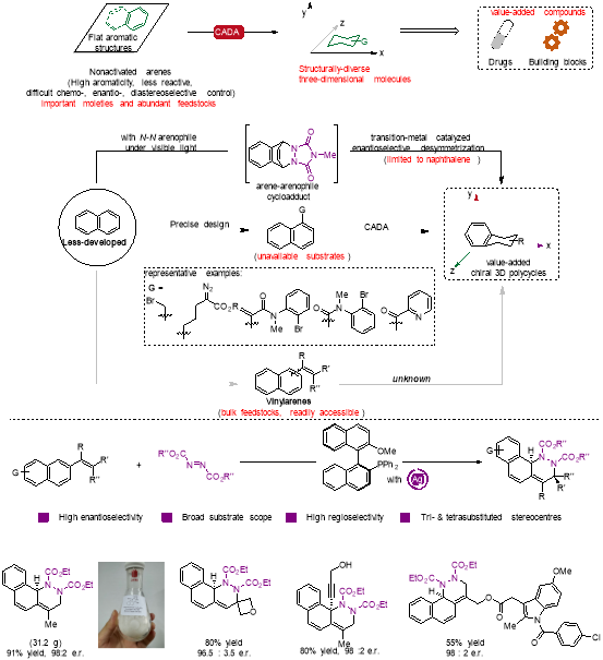 高对映体富集的脂肪族多环骨架结构是众多药物和生物活性天然产物的核心结构单元。这类三维骨架显著增加了分子复杂性,并深刻影响其理化性质、生物活性及毒性特征。然而其合成也面临诸多挑战,如冗长的多步合成路线和对预官能团化底物的需求。在此背景下,稠合芳烃的催化不对称去芳构化反应CADA为直接构建高对映体富集、结构多样化的三维骨架提供了一种独特而高效的策略。该策略不仅可用于生成高附加值砌块,还可促进药物候选分子的后期官能团化。过去十年间,该领域的研究主要集中在具有电子偏向性的芳香化合物(如苯酚、萘酚、萘胺以及吲哚)上,然而萘类化合物因其显著的芳香性,在CADA反应中的应用仍面临巨大挑战。