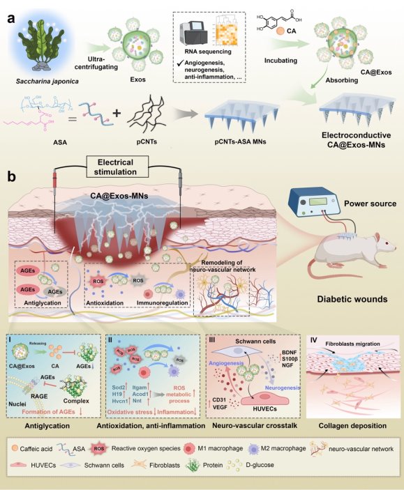 研究团队构建了一种新型生物-电疗法平台,通过将咖啡酸工程化的海带(Saccharina japonica)外泌体(CA@Exos)物理吸附到导电琼脂糖微针针尖中,利用CA@Exos产生的生物信号与导电微针传递的电信号协同作用,重塑糖尿病创面的神经-血管微环境。应用于糖尿病伤口后,CA@Exos能抑制AGEs生成、清除活性氧并改善炎症,同时激活血管生成和神经再生信号通路,增强雪旺细胞与血管内皮细胞间的串扰。导电微针不仅实现了外泌体的皮肤深层组织递送,还作为时空可控的生物电支架,通过传递电刺激信号以促进外泌体摄取并放大内源性伤口电流。该双模式策略协同加速血管新生、神经再生与再上皮化,从而加速糖尿病大鼠全层创面愈合。研究团队将海洋生物来源的外泌体与导电微针有机结合,不仅拓展了海洋活性物质在再生医学中的应用,也展示了生物信号与物理刺激信号协同调控微环境的新思路,为临床解决糖尿病慢性创面这一重大难题提供了潜在的转化应用方案。
