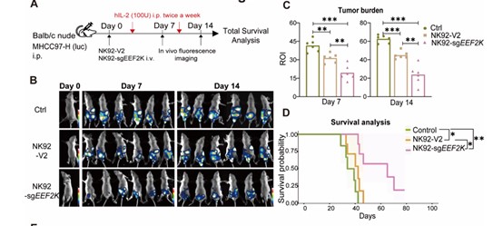 图3. NK92-sgEEF2K细胞过继疗法有效地抑制了异种移植物肿瘤的生长并延长小鼠生存期