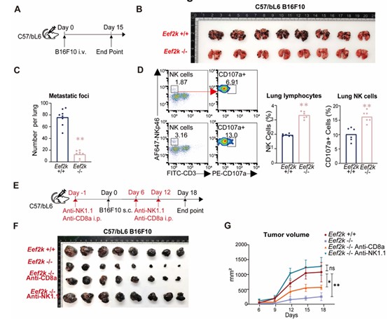 李静课题组利用肺癌患者单细胞测序大数据分析,发现代谢相关分子真核细胞延伸因子2激酶(eukaryotic elongation factor-2 kinase , eEF-2K,基因名Human EEF2K; Mu Eef2k)在肿瘤浸润NK细胞中表达上调,且可能与NK细胞耗竭有关。eEF-2K是细胞蛋白翻译的负调控因子,参与细胞生长、自噬和营养适应性调节,其在NK细胞免疫反应中的作用尚未被报道。