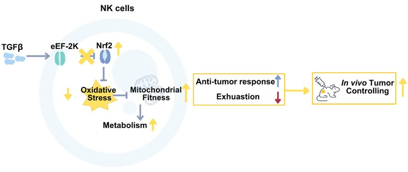 课题组利用eEF-2K转基因荷瘤动物模型、细胞株以及临床样本,证明eEF-2K抑制了NK细胞的增殖、终末分化、活化和肿瘤杀伤功能。机制研究发现,肿瘤微环境中的主要免疫抑制因子TGF-β诱导eEF-2K表达,进而抑制Nrf2介导的抗氧化反应并损伤NK细胞的线粒体健康,降低了NK细胞的代谢功能,从而抑制了NK细胞的抗肿瘤作用。体内治疗实验表明,靶向抑制eEF-2K能够显著增强NK细胞对抗多种肿瘤的生长和抗转移作用。特别是,与对照细胞相比,NK92-sgEEF2K细胞在肿瘤组织内的衰竭减少,存留时间延长,从而显著提高其抗肿瘤作用。本研究表明 eEF2K是影响NK细胞功能命运的重要参与者。本研究为提高基于NK细胞抗肿瘤免疫治疗提供了新的治疗靶标,也为新型的抗肿瘤CAR-NK的构建提供了新思路。